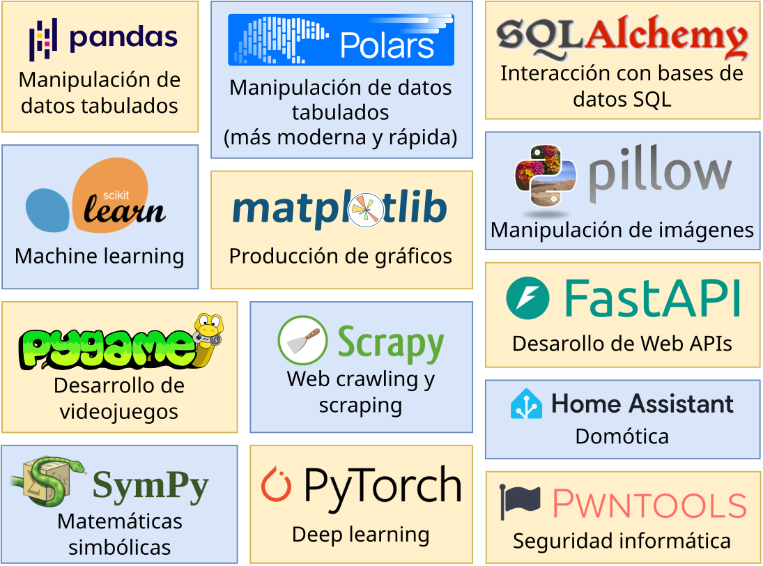 Python posee un ecosistema con una gran cantidad de paquetes que proveen funcionalidades adicionales para muchos propósitos, los cuales son creados por la comunidad de Python. Estos paquetes pueden instalarse desde el repositorio Python Package Index (PyPI).